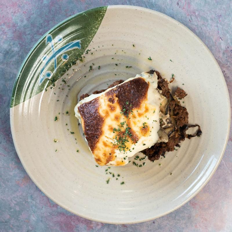 Layered potatoes, eggplant, ground beef, béchamel.